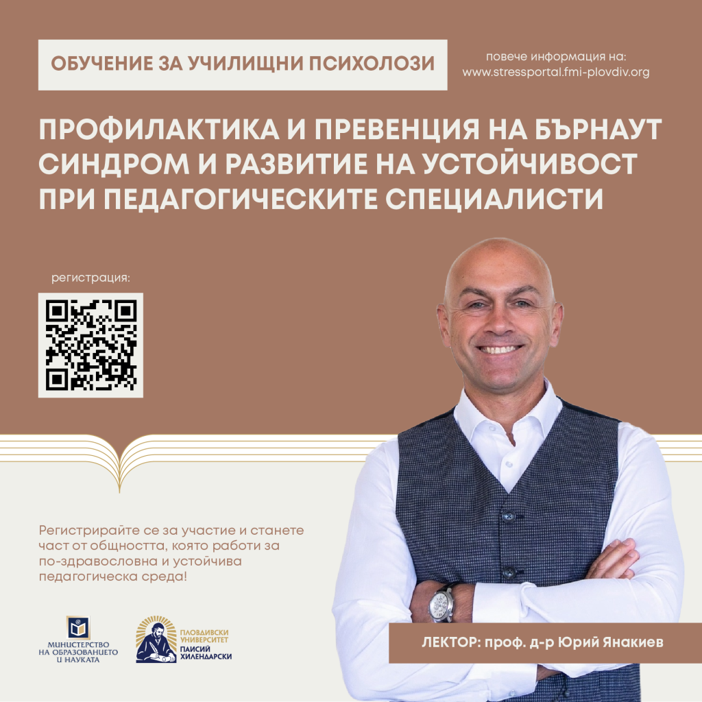 Министерството на образованието и науката и Пловдивският университет „Паисий Хилендарски“ имат удоволствието да Ви поканят да се включите в обучение на тема: Профилактика и превенция на бърнаут синдром и развитие на устойчивост при педагогическите специалисти.