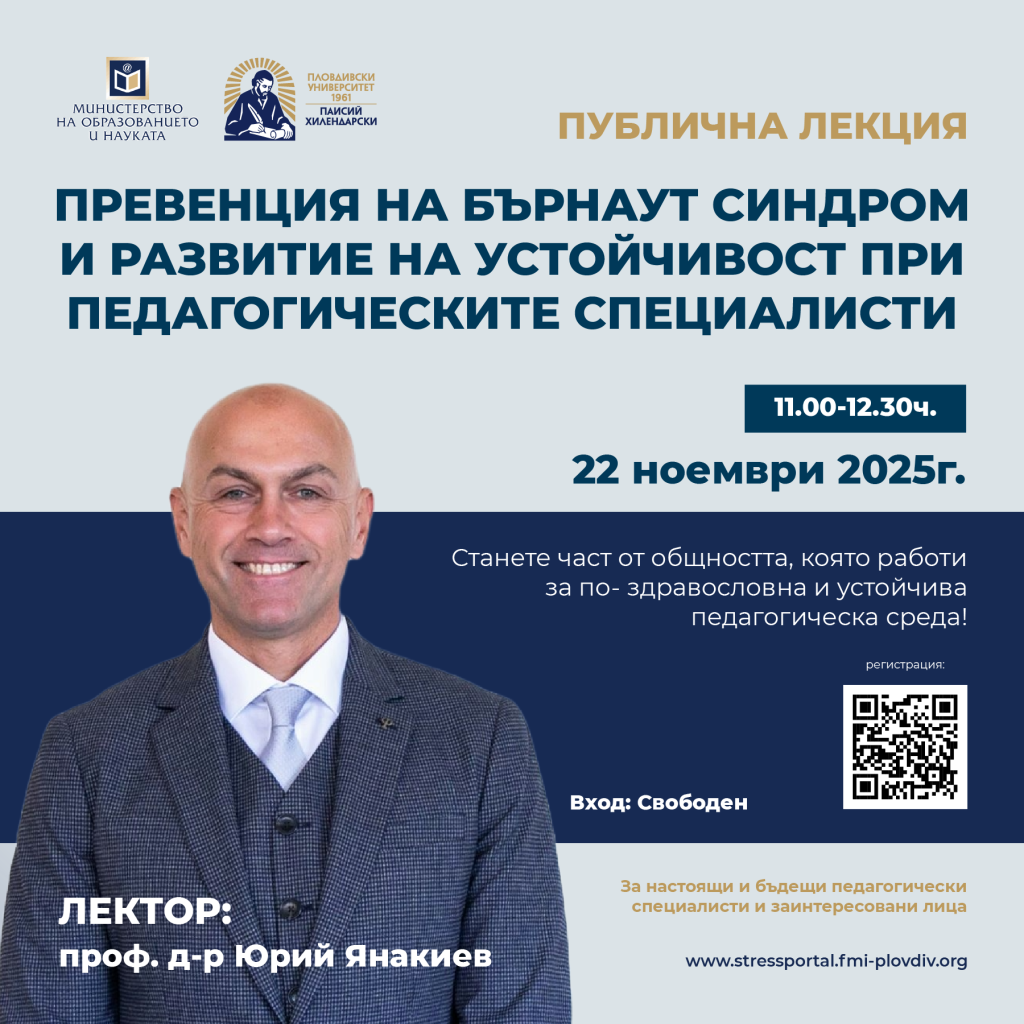 Министерството на образованието и науката и Пловдивският университет „Паисий Хилендарски“ имат удоволствието да Ви поканят да присъствате на публична лекция на тема: ПРЕВЕНЦИЯ НА БЪРНАУТ СИНДРОМ И РАЗВИТИЕ НА УСТОЙЧИВОСТ ПРИ ПЕДАГОГИЧЕСКИТЕ СПЕЦИАЛИСТИ