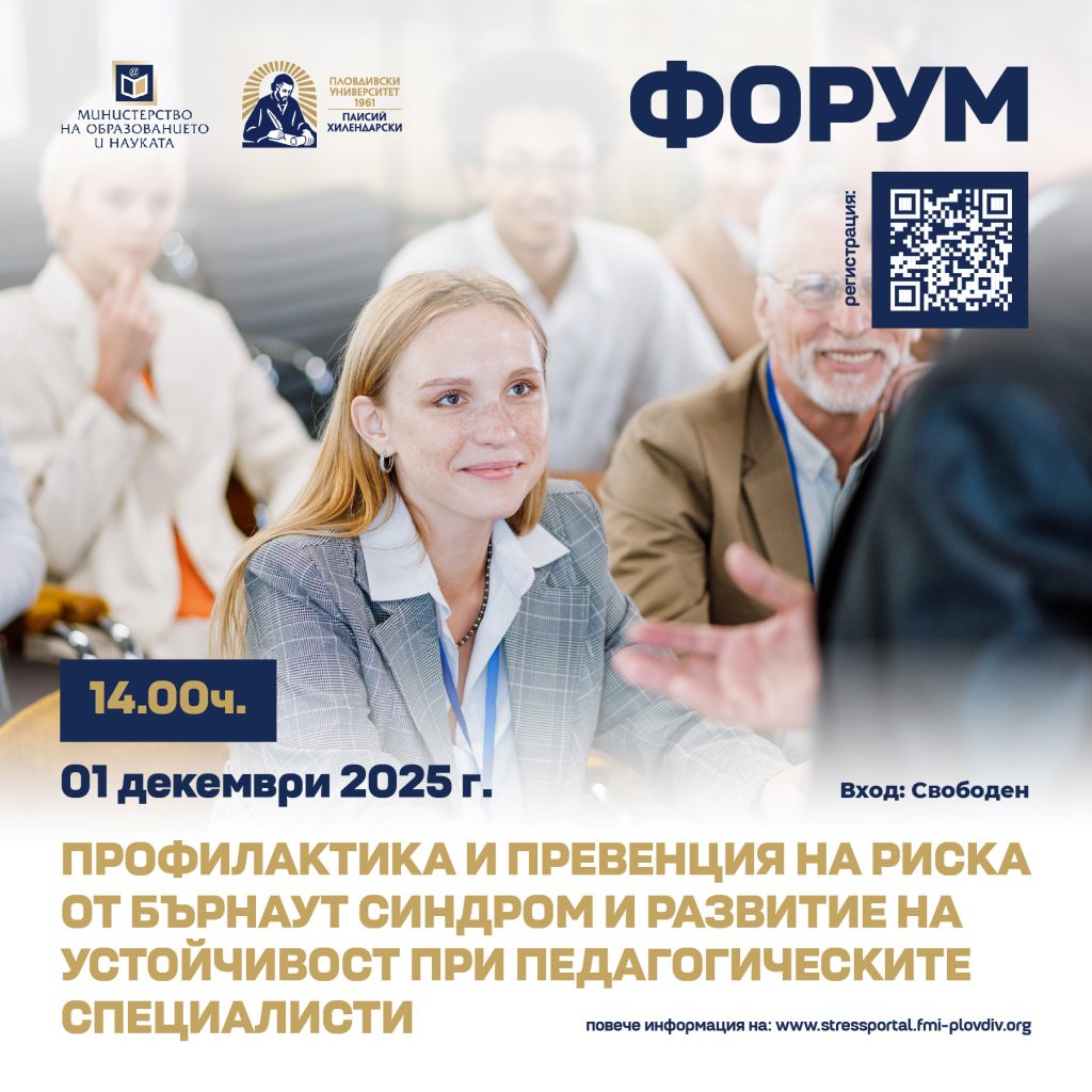 Форумът ще събере представители на МОН, на образователните институции, университетската общност и практикуващи специалисти, за да обсъдят реални решения и политики за превенция на професионалното прегаряне и изграждането…